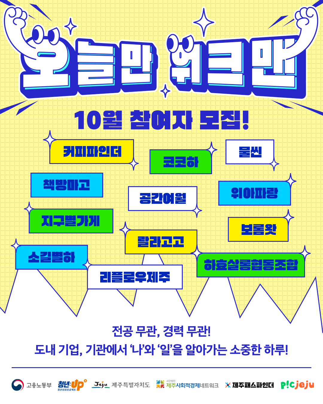 - 대상 : 제주 거주 청년 (19~39세), 총 10명 - 모집기간 : 10월 10일(금)까지 - 내용 : 좋아하는 일 업으로 삼기 / 구좌 사장님이 들려주는 덕업일치 이야기