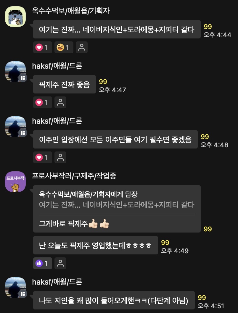 수다방에 이런 글이 올라온 걸 보고 너무 뿌듯하고 고마워서 캡쳐해 두었더랬지. 최근엔 '제주의 GPT' 라며 '픽제주=제지피티'로 부르는 것도 들었더랬거든.