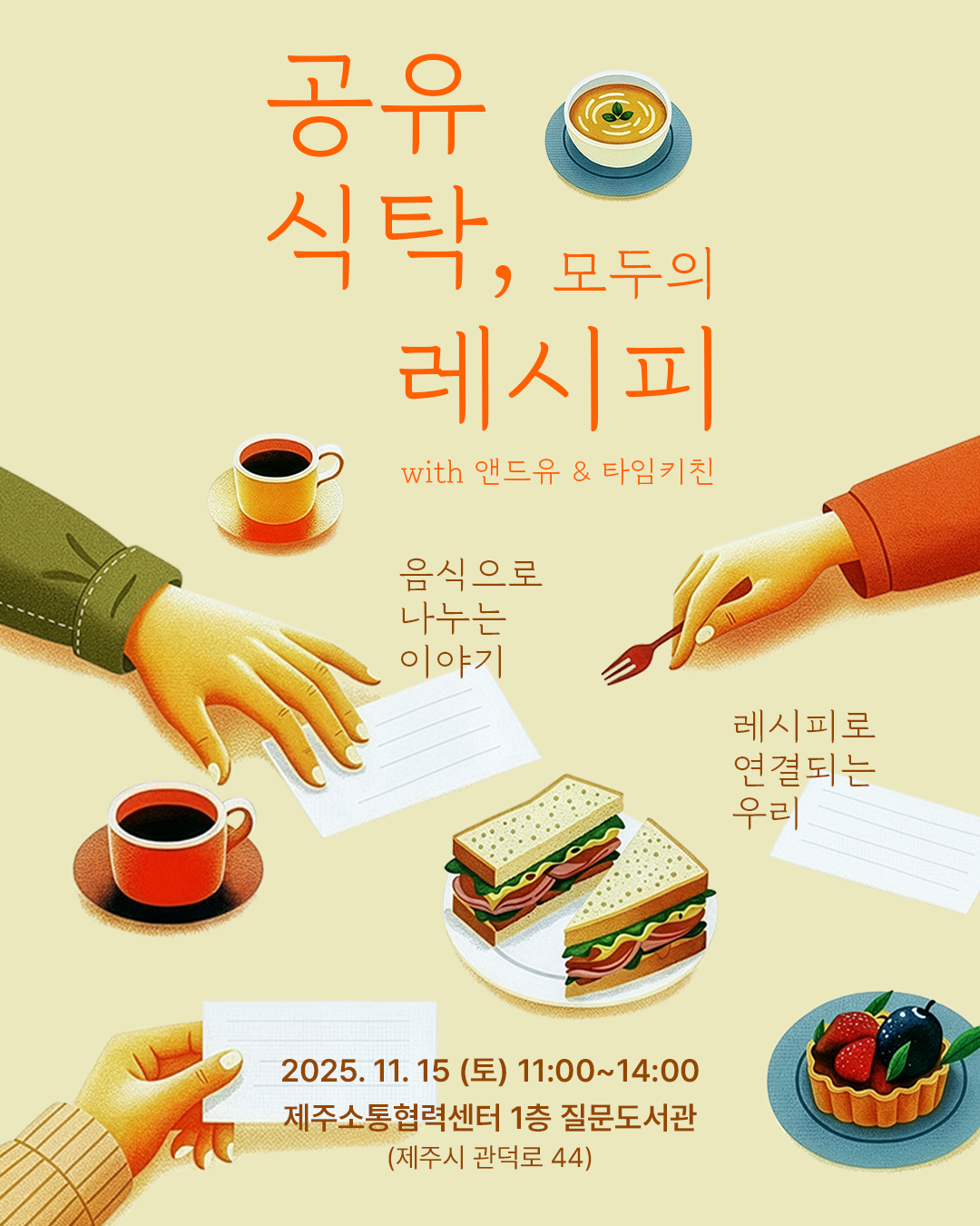 앤드유와 타임키친이 제철 재료로 맛있는 점심(샌드위치, 수프, 타르트 등)도 준비할 거야. 모두의 레시피로 차려낼 ‘공유식탁’ 지금 바로 신청해! 👇