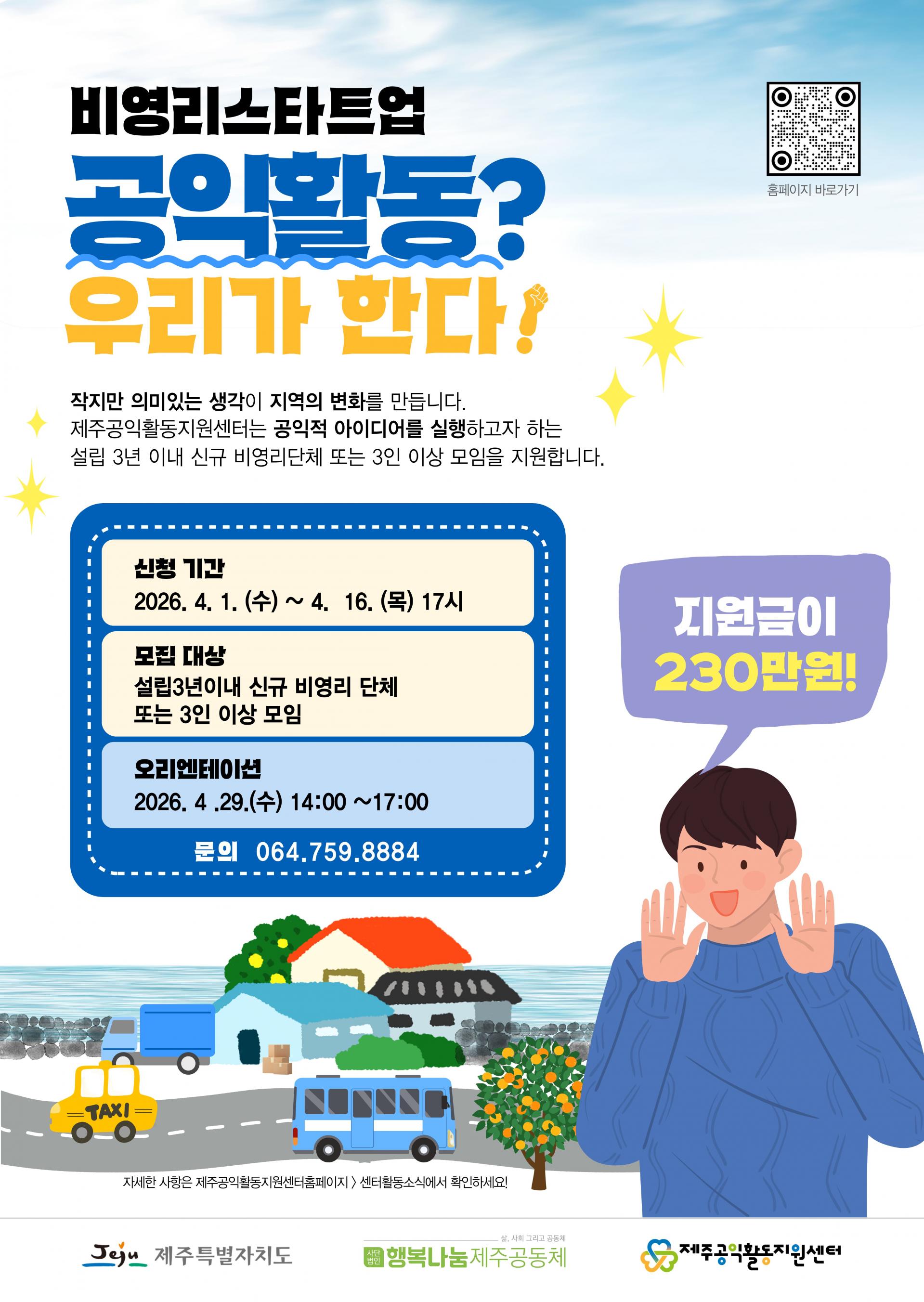 , 사회와 이웃들에게 도움이 될 것 같은 일을 해보고 싶은 마음이 든 적 있지 않아? 공익을 위한 착한 일을 해볼 수 있게 교육과 비용을 지원하는 사업이 있으니 이번에 도전해 봐! 3명 이상 모임 또는 설립 3년 이내 비영리 단체면 지원할 수 있고, 선정되면 교육이랑 네트워크, 다른 지역 연수 기회에 최대 230만 원의 지원금도 나온대. 😲