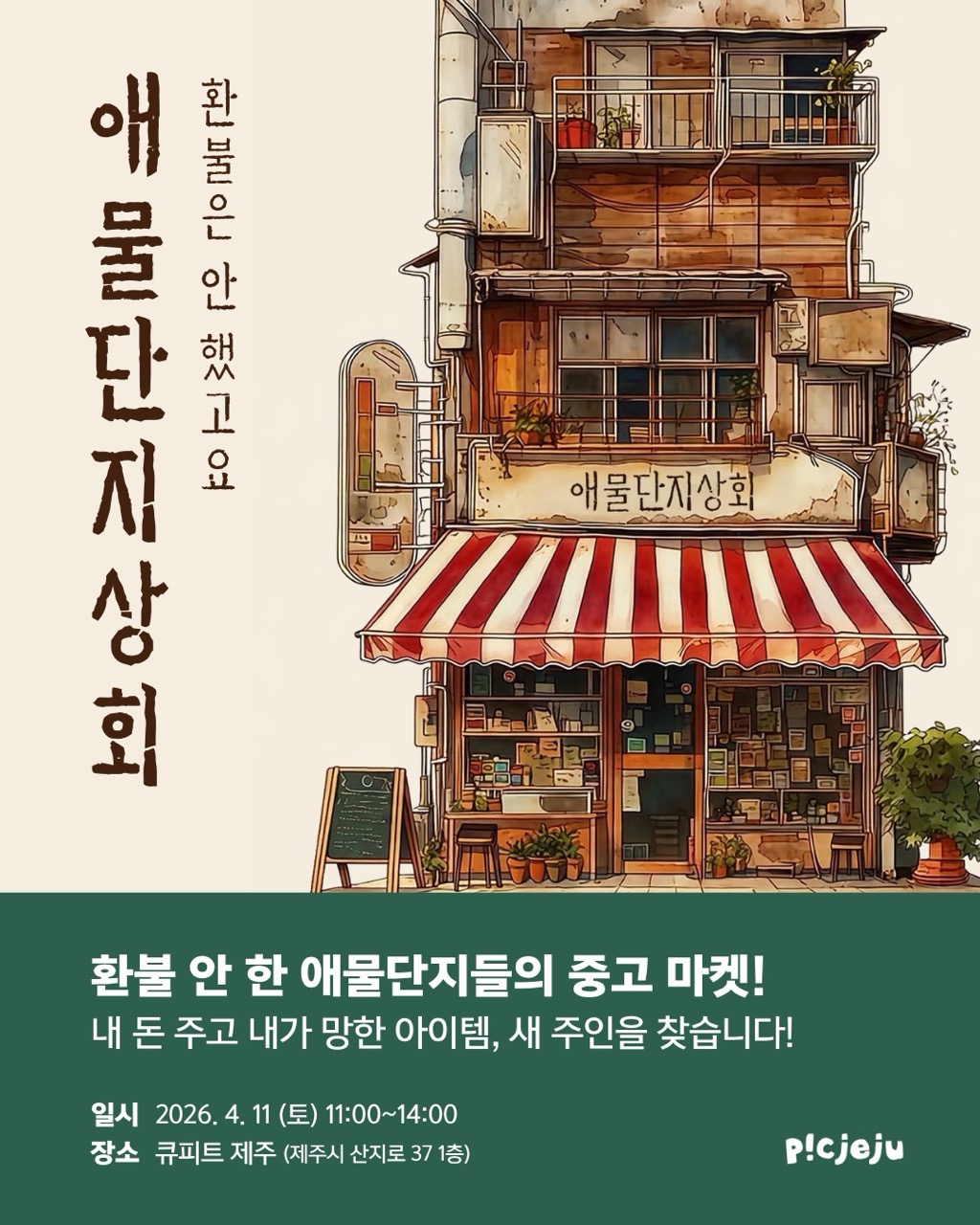 토요일에 애물단 지상회 열리는 거 알지? 옷, 노트북, 책, CD, 모자, 가방, 전자기기들까지 라인업 화려하고 제주씨들을 위한 이벤트도 있으니 북페일 오가는 길에 놀러 와! 🤗 |
